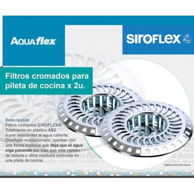 Filtro cromado plastico (ABS) para pileta, bacha, bañaderas, lavatorios etc x 2 Unidades Siroflex HECHO EN ITALIA Retiene todo tipo de desperdicios, restos de comida, pelos, etc, facil de limpiar. Plastico ultra-resistente al maltrato diario, protección UV Resistencia: 60º a -6º de temperatura ambiente ______________________________________________________ Siroflex Blue line Italia: Siroflex el lider en el mundo de los dispositivos de plomería especializada y accesorios utilizados para instalar lavarropas y lavavajillas. Tambien cuenta con una gama de productos de linea que conquistó el mercado particularmente con la innovadora invención del primer conector de plástico rápido para uso doméstico. Posteriormente con la investigación técnica, Siroflex diversificó y amplió su gama para incluir productos específicamente desarrollados para la "Casa y Jardín" No sólo incluyendo una amplia gama de sistemas de riego, sino también una serie de productos prácticos y útiles, incluyendo primer aireador con ducha del mercado. Siroflex ha utilizado sus notables conocimientos y experiencia para fabricar diseños sencillos resultando en sistemas libres de problemas, que son fáciles de usar e instalar. ______________________________________________________ AQUAFLEX ARGENTINA UBICACIÓN: Retiro en persona LOCAL A LA CALLE, CAPITAL FEDERAL BARRIO NUÑEZ Estamos ubicados en CAPITAL FEDERAL, BARRIO NUÑEZ ( Cerca Estadio Obras, Club Ciudad, la Esma) Nuestro horario de atención es: de Lunes a Viernes de 8 a 12 y 14 a 16hs. ( Sabados,domingo y feriado cerrados) TE OFRECEMOS: - 1 SEMANA para el cambio inmediato (Mientras se encuentre en las mismas condiciones que se entregó) - Personal capacitado para ofrecer asistencia inmediata - Service propio - Atención especial a Compras Mayoristas. -------------------------------------------------------------------------------------------------------------------------------------------- FORMAS DE PAGO: - Podes pagar a través de mercado pago con tarjeta de débito o crédito Y Qr - En efectivo generando un cupón de pago y luego dirigiéndote al centro de pago más cercano. --------------------------------------------------------------------------------------------------------------------------------------------- Si precisas Factura A, Somos agente de retención, favor pasar cm05 ( inscripción a ingresos brutos o convenio multilateral según corresponda) muchas gracias, luego la factura se adjuntara acá mismo. luego de ser entregado el pedido. Con el numero solo no nos alcanza, necesitamos los comprobantes para saber en qué provincia hay q retener .Infórmanos tu CUIT y Razón Social. De lo contrario enviaremos Factura B. -------------------------------------------------------------------------------------------------------------------------------------------- FORMAS DE ENVIO: -Mercado envíos a todo el país. -Mercado envíos FLEX (comprando hasta las 14hs envíos en el día en CABA y GBA, con entregas hasta las 21hs). -Retiro en persona LOCAL A LA CALLE, CAPITAL FEDERAL BARRIO NUÑEZ También hacemos envíos con mensajería propia: si necesita: consultar costo según zona Hace todas las consultas que necesites antes de realizar tu compra ¡Estamos para asesorarte! 30 años en el mercado, primeras tienda oficial de mercado libre. 30 años de trayectoria. Proveedores de hipermercados, comercios y grandes empresas. MUCHAS GRACIAS POR CONFIAR EN NOSOTROS. AQUAFLEX ARGENTINA SRL