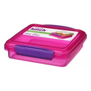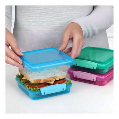 Contenedor Sistema Lunch Sandwich de 450ml, de color con cierre de seguridad. Su tamaño es ideal para llevar de almuerzo sandwichs. Este contenedor ha sido desarrollado especialmente por Sistema. Cuenta con el Sistema Klip It, dos clips en los laterales que hacen que el bloqueo sea fácil y seguro. El sello interno flexible y los clips de bloqueo ayudan a que los alimentos permanezcan frescos por más tiempo. Tiene un sistema compacto de almacenamiento apilable que ahorra espacio. Es apto para freezer, lavavajillas (estante superior) y microondas (sin tapa). Tiene una capacidad de 450ml. Está libre de BPA y Ftalatos. Hecho en Nueva Zelanda. Mide 15,5 cm x 15,5 cm. Las imágenes y colores son a modo ilustrativo, pueden variar.